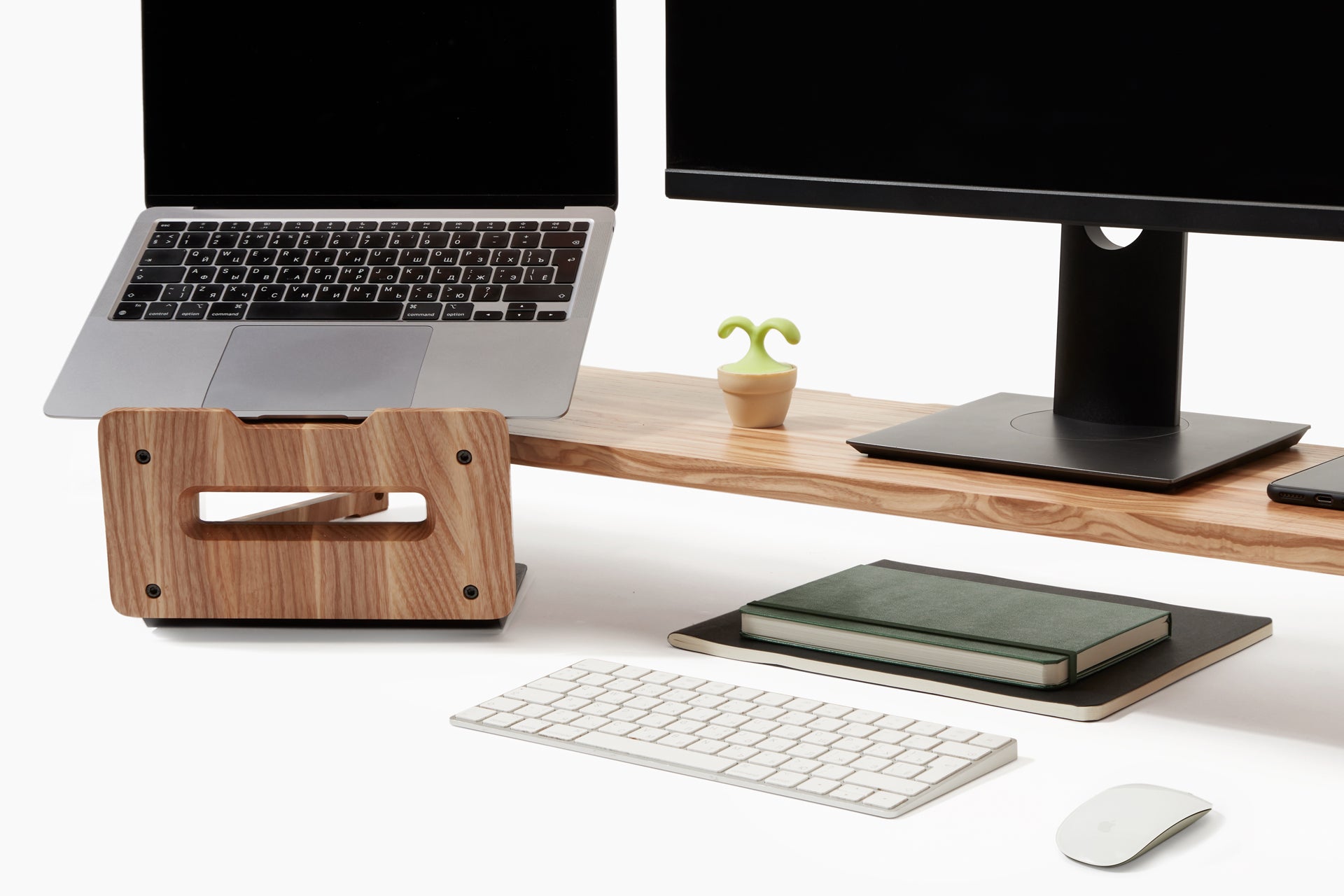 Works perfectly in combination with MO:SH — adjustable monitor shelf. Specially made to save more desk space for creativity and new ideas. Simply slide it into the MO:SH and both of your screens will not only be at the same height, but also in the same plane. No matter the size of your laptop, LA:RI is designed to accommodate both small and large diagonals for comfortable placement.